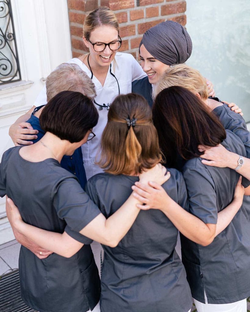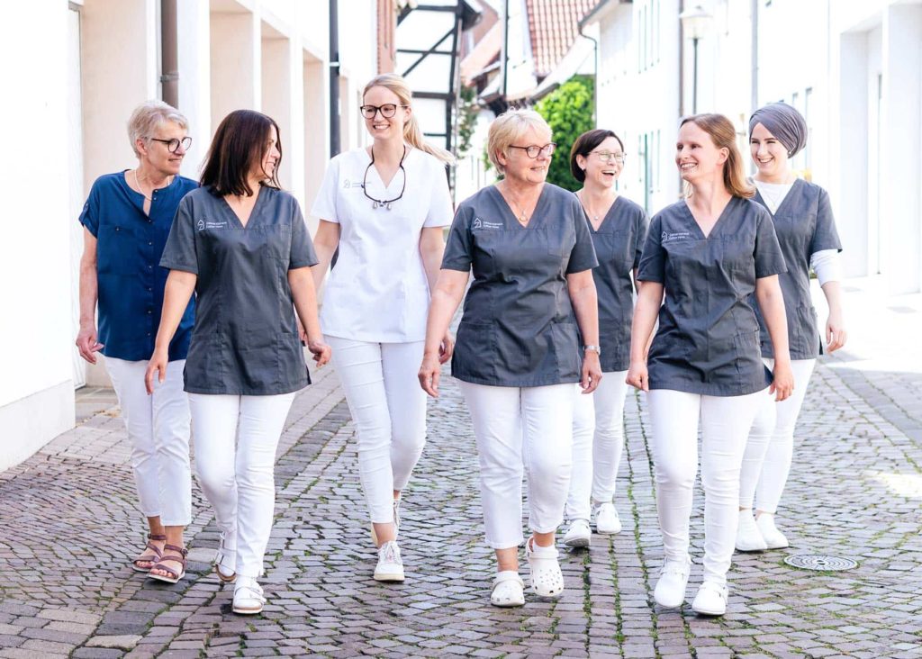 Von links nach rechts: Hildegard Bar (Empfang und Abrechnung), Kristina Bene (Prophylaxe), Esther Henn (Zahnärztin), Andrea Mönch (Stuhlassistenz), Beate Hubacz (Prophylaxe), Melanie Börner (Abrechnung, Prophylaxe) und Kezban Tigci (Stuhlassistenz).